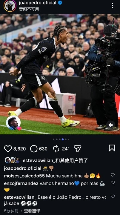 03月 06 2026 0 天天盈球网-上演帽子戏法的若昂·佩德罗社媒晒照,恩佐、凯塞多等众队友点赞 xiaoqiao 2026-03-06 英超 1538 3月5日讯 在本轮英超,切尔西4-1大胜维拉。本场比赛若昂·佩德罗贡献3射1传,赛后他也在个人社媒晒出庆祝进球照片,恩佐、凯塞多、埃斯特旺等诸位队友都为其点赞评论,其中恩佐写道:“加油兄弟,进球越来越多!”